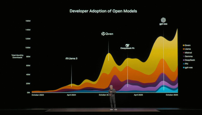 北京时间10月29日凌晨,英伟达CEO黄仁勋在华盛顿举行的2025GTC大会上发表主旨演讲时称,开源模型已变得非常强大,大大加速了AI应用的进程,开发者、研究者、全球的公司都需要开源。黄仁勋展示了全球开源模型的下载及采用情况图,2025年以来,来自中国的阿里通义千问Qwen已占据开源模型的大部分市场份额,并且领先优势还在持续扩大中。